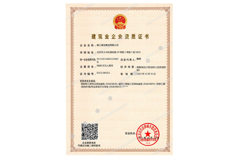 戴工建設(shè)集團(tuán)有限公司,創(chuàng)建于2009年,注冊(cè)資本9888萬元人民幣。公司位于北京市大興區(qū)。具有建委頒發(fā)的建筑裝飾裝修專業(yè)壹級(jí),防水保溫工程專業(yè)壹級(jí),建筑幕墻專業(yè)貳級(jí),消防設(shè)施專業(yè)貳級(jí),電子與智能化專業(yè)貳級(jí),特種工程(結(jié)構(gòu)補(bǔ)強(qiáng))專業(yè)不分等級(jí),建筑機(jī)電安裝專業(yè)貳級(jí),環(huán)保工程專業(yè)貳級(jí),鋼結(jié)構(gòu)專業(yè)貳級(jí),建筑工程總承包貳級(jí),建筑裝飾工程設(shè)計(jì)專項(xiàng)甲級(jí),展覽陳列工程設(shè)計(jì)與施工壹級(jí),展覽展示工程壹級(jí)...更多>>